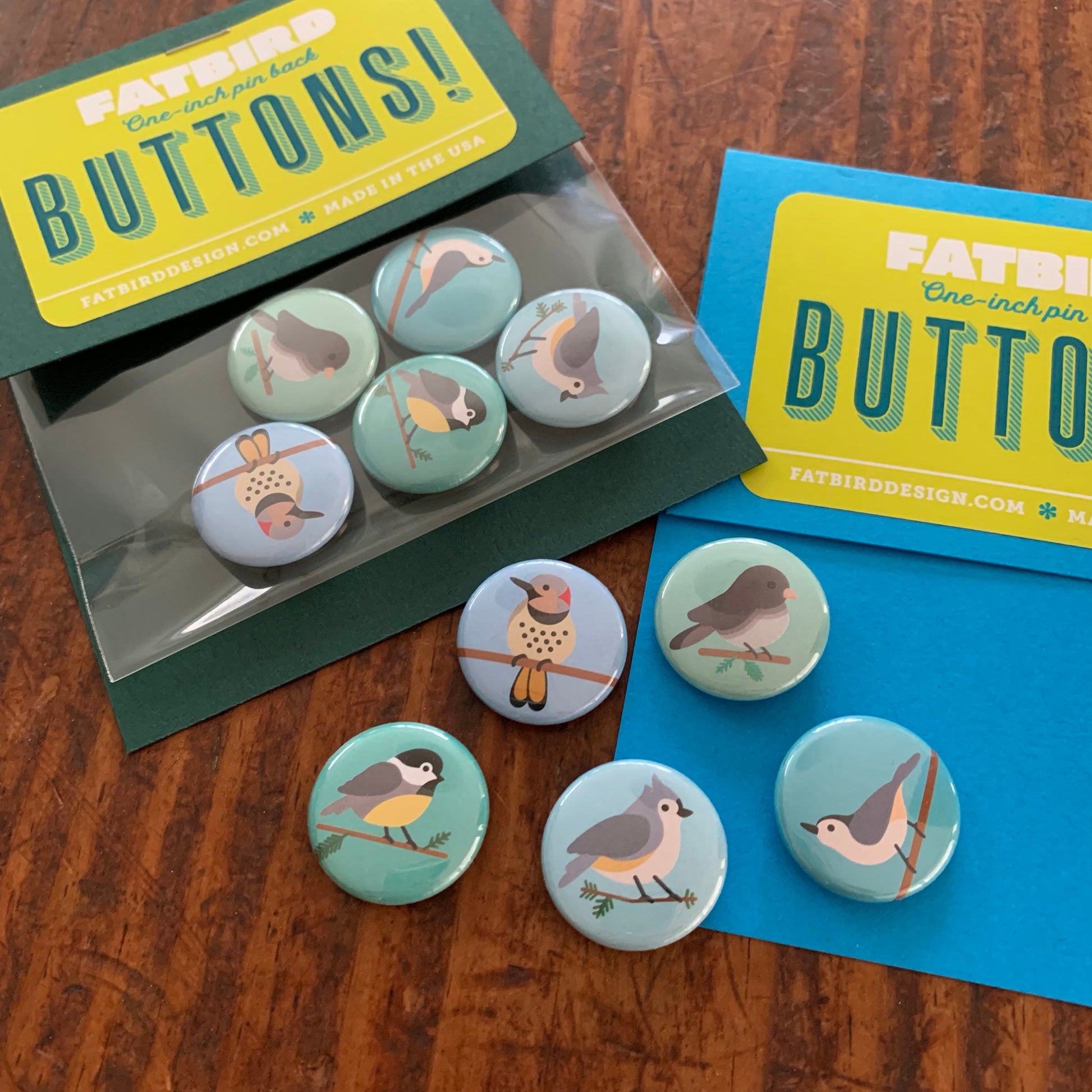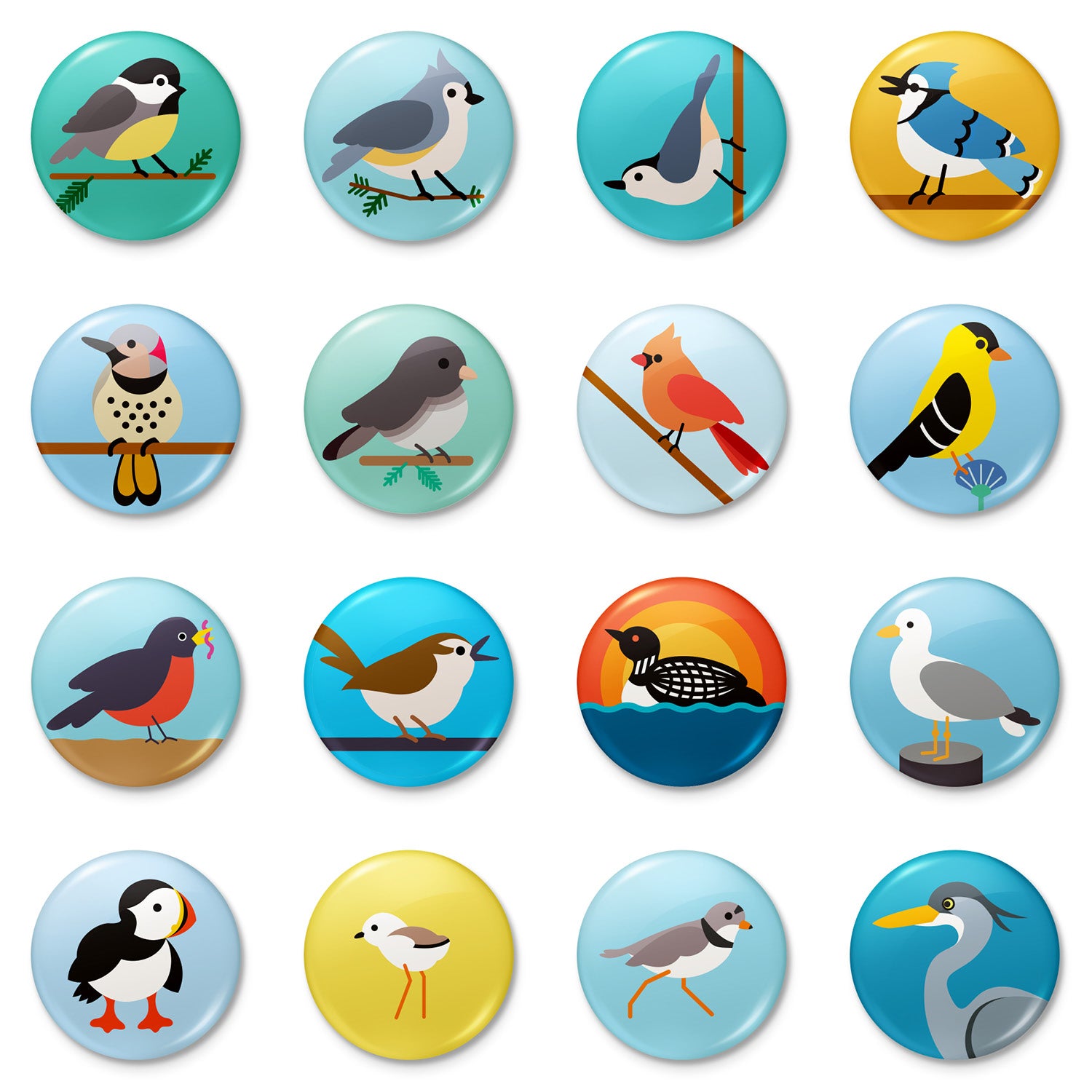 Set contains FOUR 1-inch bird buttons. Variety including: Black-capped Chickadee, Tufted Titmouse, White-breasted Nuthatch, Blue Jay, Northern Flicker, Dark-eyed Junco, Cardinal, Goldfinch, American Robin, Carolina Wren, Loon, Seafull, Puffin, baby Piping Plover, adult Piping Plover, or Great Blue Heron.